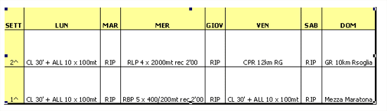 RLP: Ripetute Lunghe in pianura, servono per migliorare la soglia e la tenuta al ritmo gara, il ritmo di corsa è di 5" + lento del ritmo gara sui 10km; |