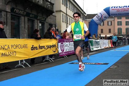 Convinto che il pre gara abbia la sua importanza, sabato sera decido di dormire sul divano (per la felicità di mia figlia Francesca a cui cedo il posto nel lettone) ed evitare di essere coinvolto nel pasto notturno del piccolo Alessandro. Questa volta sono ben preparato e (quasi) certo di poter centrare l'obbiettivo di scendere sotto 1.24. Nella sede Fò di pe campeggia da giorni alla parete, un foglio scritto e firmato sul tempo dichiarato (1.23.59) per la mezza di Crema, che divide i soci in tifosi, e iettatori. Sono le 2.30 circa, quando nel cuore della notte vengo bruscamente svegliato da un frastuono. Nel togliere dal frigo il byberon per la creatura, l'incauta moglie urtava la pirofila colma di tiramisù (infatti mi ha fatto"tirar sù" dal divano) facendola cadere rovinosamente a terra. Un breve, ma vivace scambio d'accuse sulle responsabilità: secondo me, lei l'aveva riposta malamente, secondo lei, io, nell'estrarre un vasetto di yogurt ne avrei modificato gli equilibri, non cambia comunque la sostanza, lei se ne va col byberon, io resto con straccio e paletta. Vedere tutta quella "crema" spiaccicata a terra non è di buon auspicio. Riesco malgrado tutto a riaddormentarmi, e alle 6.45 sono in piedi. Appuntamento alle 7.15 a Zanica con "Battiato" anche lui a caccia del personale. Tutto ben organizzato: parcheggio, consegna pettorali e borse all'interno di un parco alle porte della città, adiacente a partenza ed arrivo, bagni e docce nelle vicinanze. Solo il borsone (pacco gara) pareva in un primo momento misero e spartano, per aquisire succesivamente simpatia viste le ridotte dimensioni, consone con gli spazi liberi del mio armadio. Prima della partenza cerco qualche compagno d'avventura ma, l'unico che conosco, Sigismondi dei Runners BG viene da un lungo infortunio e punta a 1.25/1.26. Si parte, nei primi chilometri sono accompagnato da pessime senzasioni, entrambe le parti posteriori delle cosce sono contratte e fatico a far girar le gambe. Al 4km passo in 16.20 e decido ti aumentare il passo, le gambe finalmente cominciano a girare e nei km successivi recupero posizioni e morale. Verso l'ottavo raggiungo e supero Sigismodi che già al 2km mi era sgattaiolato via. Al 10km sono un orologio svizzero e passo in 40 netti, si tratta di limare una trentina di secondi nella seconda parte, e sto già correndo sotto il 4 da alcuni km. Corro da solo e mi pongo come obbiettivo ogni podista che mi precede. Al 13km il primo segnale, un gatto nero attraversa la strada e mentre l'atleta di fianco impreca, il felino si ferma un attimo e mi lancia un'occhiata fugace come se volesse dirmi: "tranquillo non porto sfiga" annuisco e proseguo. Effettuo diversi sorpassi (senza subirne alcuno) verso il 17km la stanchezza comicia a farsi sentire (il Garmin mi da un leggero vantaggio, la realtà impone un finale da mezzofondista ) ma sono comunque speranzoso. Il prossimo obbiettivo sono un non vedente ed il suo accompagnatore (sinceri complimenti ad entrambi), che fatico moltissimo a raggiungere e non riesco a staccare. Mi sento una m.... quando, per prendere vantaggio taglio netto una curva e punto al prossimo avversario. Sono al 19km, decido di non guardare il crono e dare comunque tutto. Davanti vedo un gruppetto, ma è irraggiungibile, solo una ragazza mi sembra stia perdendo terreno, è il mio ultimo obbiettivo, se raggiungo lei, mi dico, è fatta. L'ultimo km si snoda nel centro storico della città e l'incitamento del pubblico aiuta a superare la fatica ( negl'ultimi 2km, un giro di boa ed alcune curve a novanta